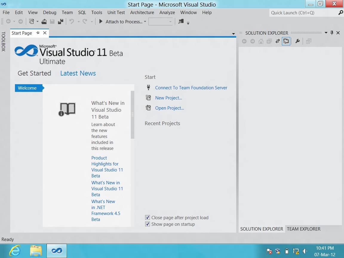 13) Being a hard core developer at heart I couldn't resist installing upcoming versions of all the software on Windows 8. Below is the screen shot of Visual Studio 11 Beta.