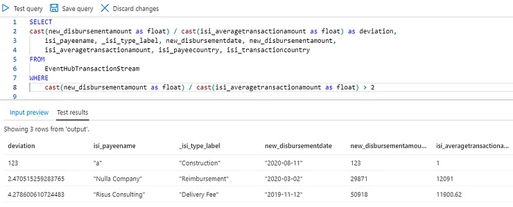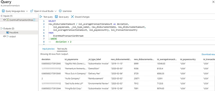In the screenshot below, the query reads subset of fields from posted events and calculates a simple deviation of payment to average amounts.
