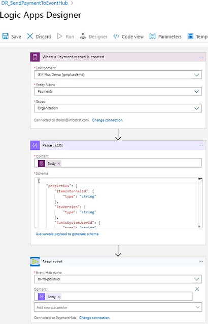I want to capture a transaction data stream from a Dynamics 365 - based system. I'm going to use an Azure Logic App to send new transactions to my event hub.
