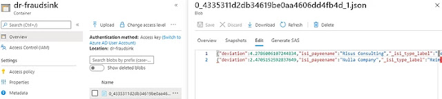 My job now has an input, a transformation query and an output. I can now start the job and monitor Payment event creation and detection. After a few Payment records are created in Dynamics 365, I can now switch to my Azure Blob container. In Azure portal I can see new blob created by my stream analytics job and two records flagged as potentially fraudulent.