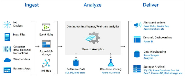 The tool to support this is Azure Stream Analytics. It is a fully managed, real-time analytics service designed to help you analyze and process fast moving streams of data that can be used to get insights, build reports or trigger alerts and actions.