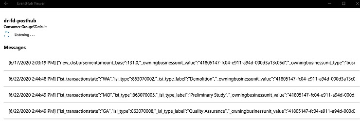 The next validation step is to connect to my event hub. I see that new records do indeed get ingested by the Azure Event Hub.