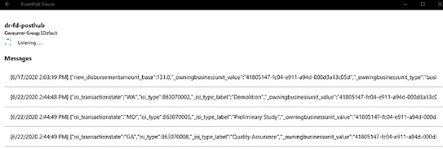 At this point, I want to make sure that my CDS data gets correctly ingested in Azure Event Hub. I'm going to create a few Payment records in Dynamics and use EventHub Viewer Windows app to make sure it's working. I can see my new Payments records in Dynamics.
