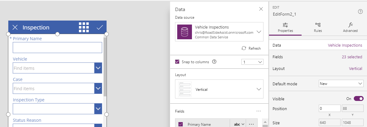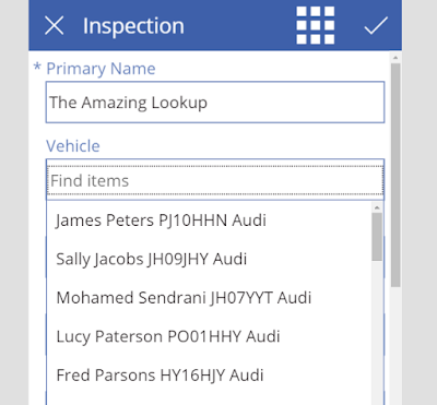 The issue I was having on my Canvass app was that when I wanted to create a new inspection, I wasn’t able to select the vehicle record. There were a few issues; In most cases I just got the vehicle record GUID and in some cases the lookup field just came up as blank (not sure why).