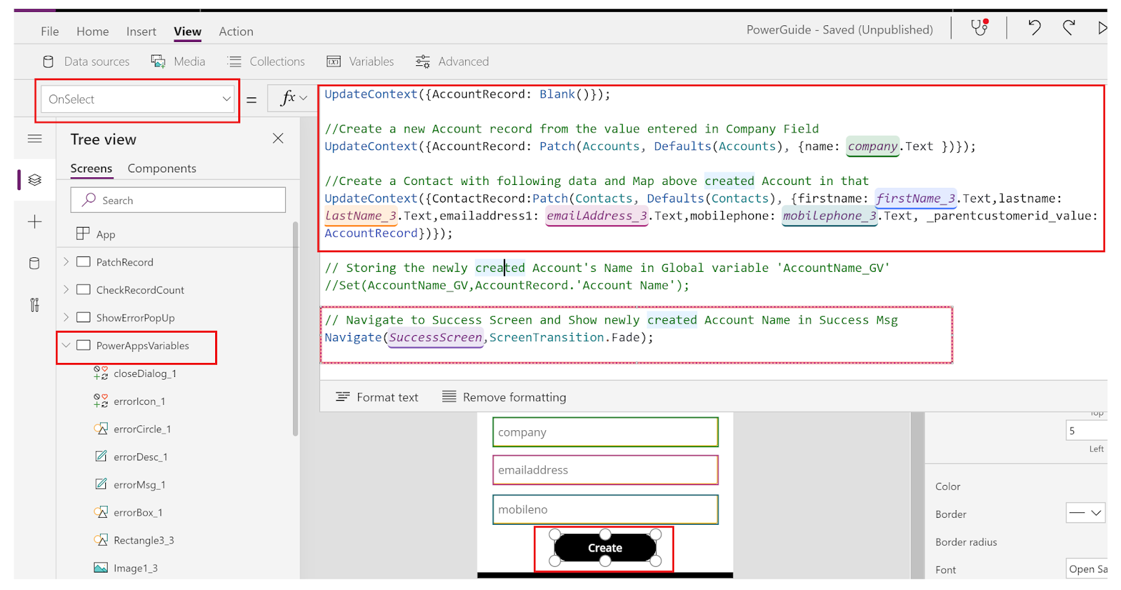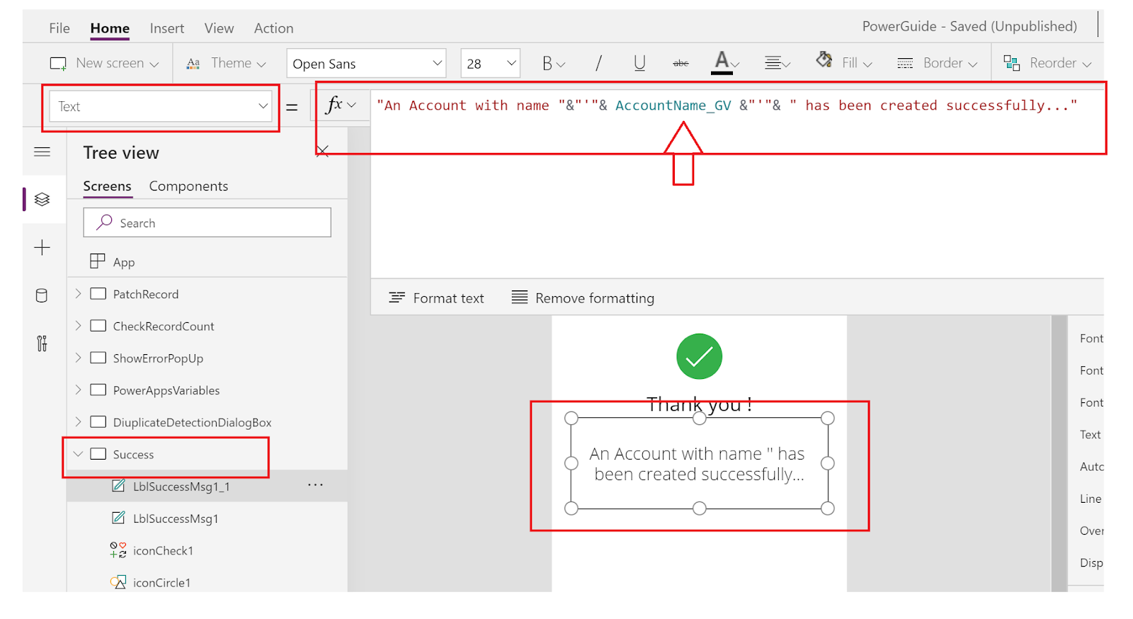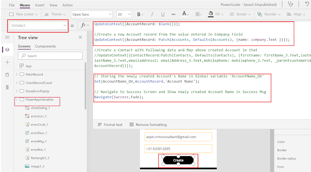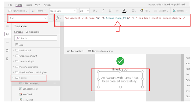 Here, AccountName_GV is Global Variable, in which I am storing newly created Account Name, so that I can access it anywhere in my Canvas App