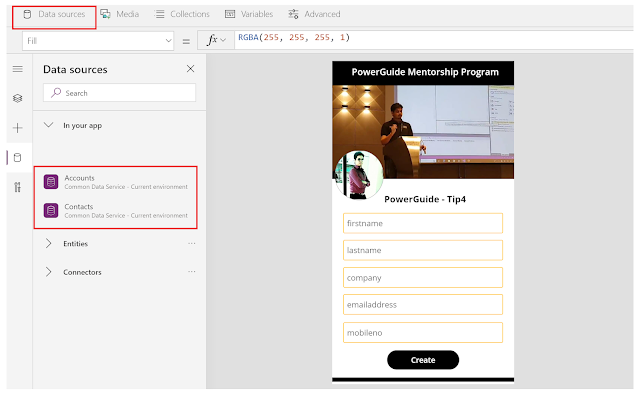 Step 1: Create a Blank Canvas App > Connect to Dynamics 365 Data Source or Common Data Service of your Environment > Connect with Account and Contact Entities.