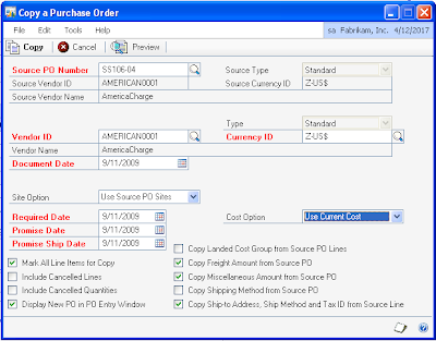 Select the PO you want to copy in the 'Source PO Number' field. As you can see, there are a number of options to choose from in this window. Select those options that are appropriate for your new purchase order and click 'Copy'. You can also choose to Preview the data that will appear on the new PO by clicking the 'Preview' button.