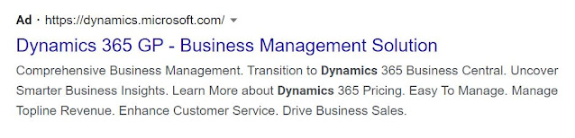 Microsoft is working hard to get customers to switch off of Dynamics 365 GP to Dynamics 365 BC. Search on Google for "Dynamics GP" and your first search result will be this ad, presumably paid for by Microsoft: