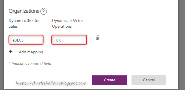 Once you've done that, you need to add your mappings. Essentially, these are your default Business Unit in Customer Engagement and the main Company in FinOps. If you are unsure what these are, a good tactic is to enter jibberish in the field and click Create - the error message thrown back will give you the values you can use. Tip: you can always add more mappings at a later stage.