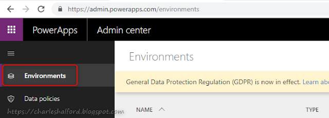 The first step to using the DI is to create an Environment (if you use Flow or PowerApps you'll be familiar with this concept already). An Environment essentially stores all of your flows, apps and data in one place. A default one will be created for you, but it's always good practice to create your own to maintain consistency and if you need to restrict access. To create an environment, log into https://admin.powerapps.com and go to Environments.