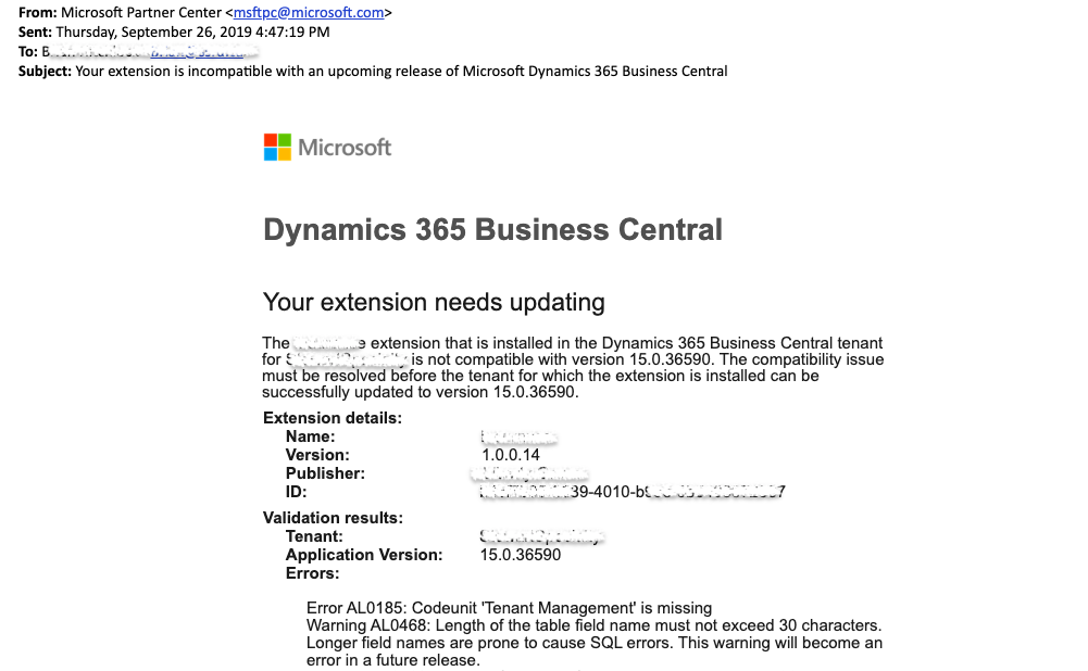 Recently, I've got a bunch number of e-mails starting with this Subject "Your extension is incompatible with an upcoming release of Microsoft Dynamics 365 Business Central"