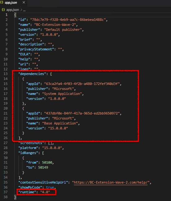So, copy dependencies to you extensions app.json file, change runtime to 4.0, change platform to 15, and don't forget to change version of your extension!