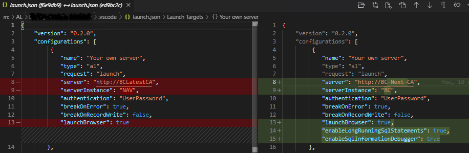 The main difference here is that "serverInstance" was changed from NAV to BC.