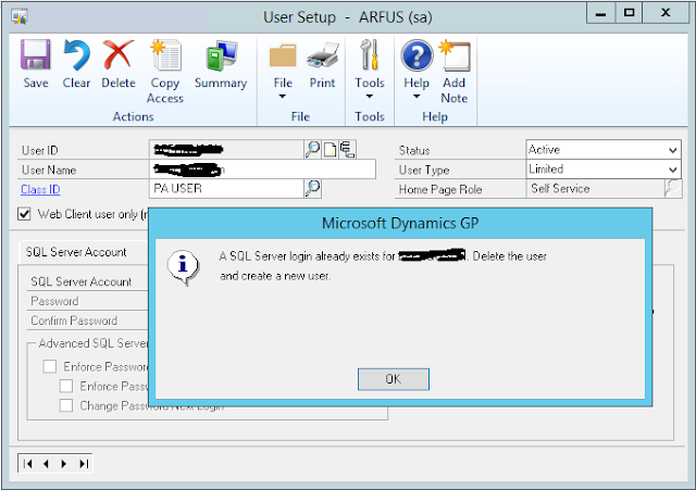 In troubleshooting this problem, the first thing is to focus on the first part of the error message, "A SQL Server login already exists". If a login already exists on SQL Server, then it should be visible under Management Studio - bear in mind that each Dynamics GP user account was setup as a web client only account to begin with. In principle, there should be no SQL Server security principal for these type of accounts.