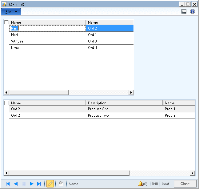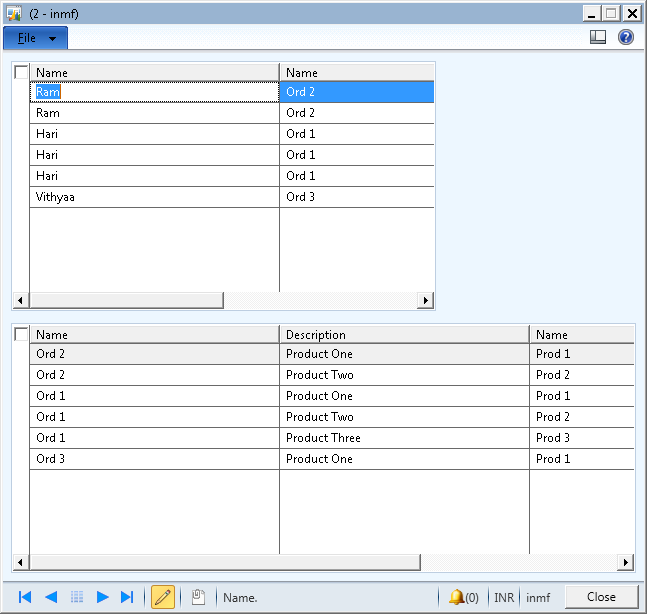 The order details grid is empty. If we need populate the child data source (order details) then we need to call the Hari_OrderDetails_ds.executeQuery() method in the parent table Hari_Order form data source active method. We can add separate button "Populate order details" and call the code Hari_OrderDetails_ds.executeQuery(). So, if the user need to see the order details then the user update by click the "Populate order details" button.