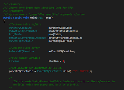 Recently I have a requirement of importing the work breakdown structure lines on request for quotation lines as per associated project. So for achieving the requirement I have develop a job that can get the WBS lines and import those line on RFQ using AxPurchRFQCaseLine class. Please see below screenshots.