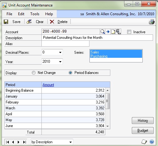 Look at the image; this is an actual unit account from my accounting system. I track the number of consulting hours in each month. I take the number of non-holiday, weekdays and assume there are 8 consulting hours for each of these days.