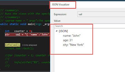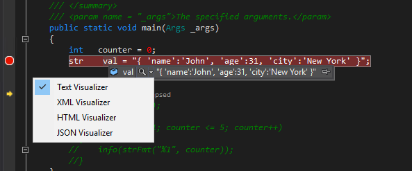 When working with strings, it can be helpful to view the entire formatted string. To view a plain text, XML, HTML, or JSON string, click the magnifying glass icon Visualizer Icon while hovering over a variable containing a string value.