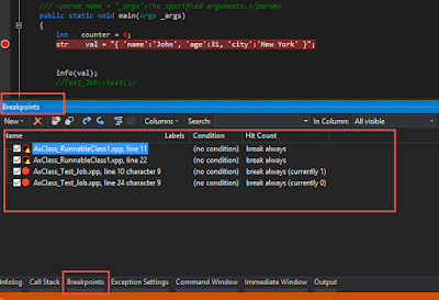 In VS when we set-up some breakpoints and now we need to switch one-off for as it’s getting hit too much but we will need it again for debugging. If we remove the break-point we’ll have to come back and find it again. So instead of removing the break-point we can use Break-point window. This window will show all breakpoints you have set but crucially lets you disable them without un-setting them by simply removing the check-mark. Check it again to re-enable it.
