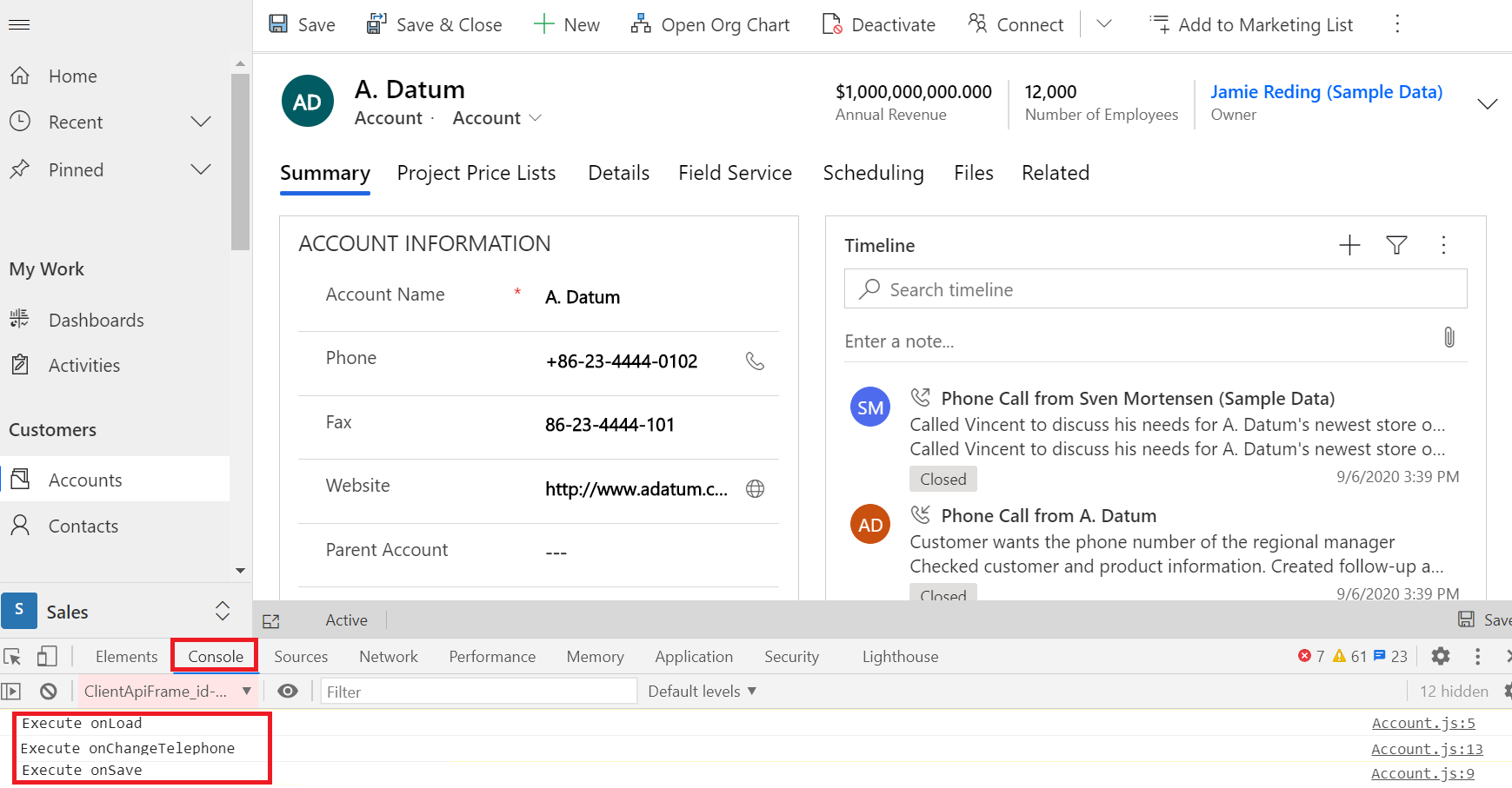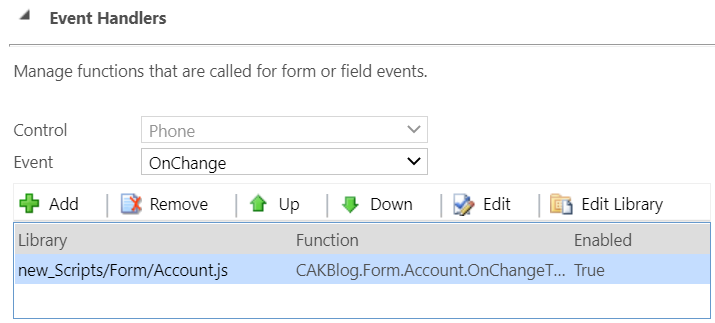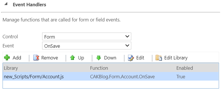 5. Finally, in order to call functions that are added into the JavaScript web resource, use the following syntax (<Namespace>.<FunctionName>) in the CRM Forms based on the event you want to use: