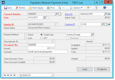 If I manually enter a Payables Manual Payment for a Credit Card Payment Method, it looks like this.