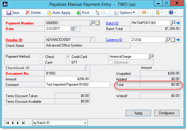 While testing, I noticed that the Total field is zero for the imported Credit Card payment.