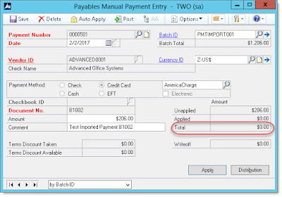 I'm working on an eConnect integration that imports Payables Manual Payments. The integration itself is working fine, but after adding support for the Credit Card payment method, I noticed an oddity.