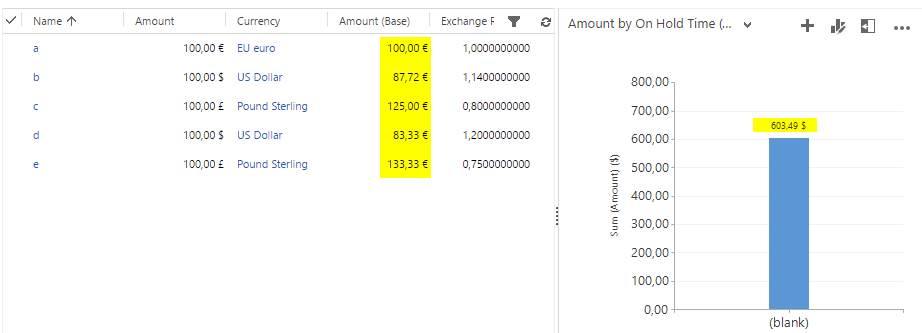 To display a sum of multiple records in a specific currency, the system will aggregate the base currency fields of the entity (so for example EUR base currency fields, even though the user has USD as a default currency), and will convert the amount in the user’s currency using the configured exchange rate in the system (and there can be only one per currency), at the time the chart is displayed.