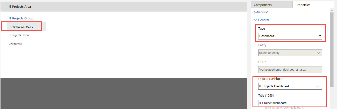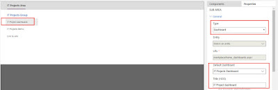 Step 3) Rename it and set following properties on it. In order link it with newly created dashboard. I moved it up so that it should be first area for user to look around.