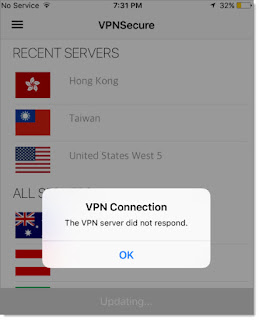 And even when one of the VPNs did appear to connect, sometimes the connection just didn't work, or the speed was so slow, or so high latency, that it was unusable. Many times my phone would appear to be connected to the VPN service, but I couldn't connect to any web sites or retrieve my email.