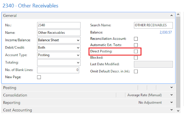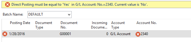 Let's see what will happen if we try to post an direct entry to this G/L account.