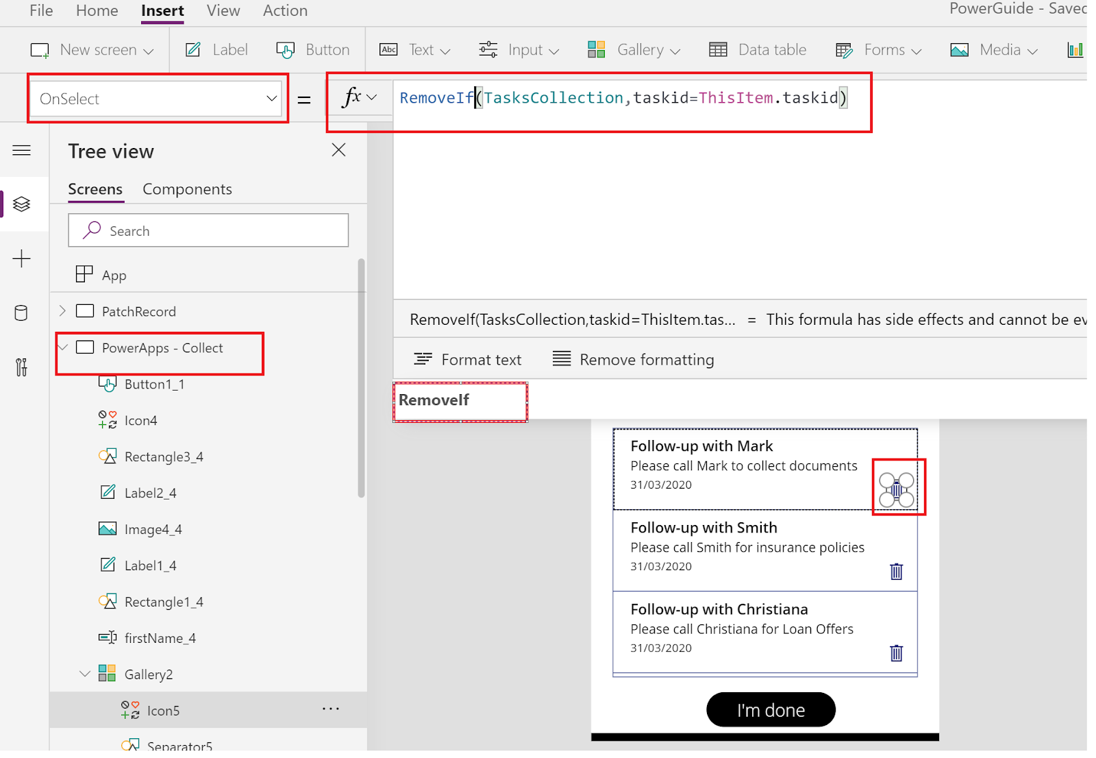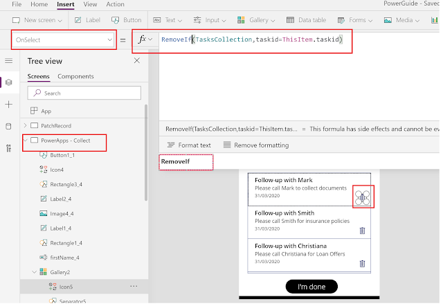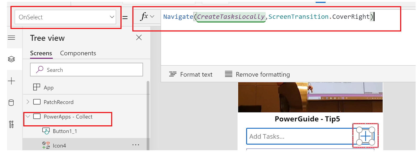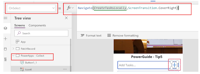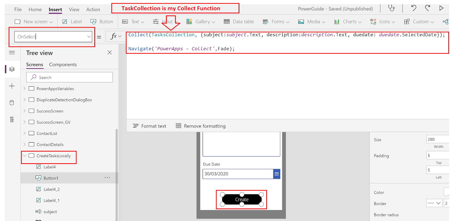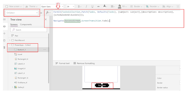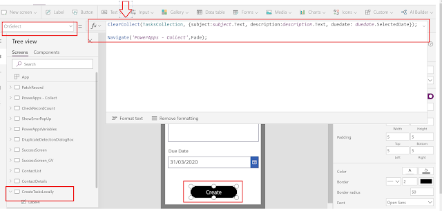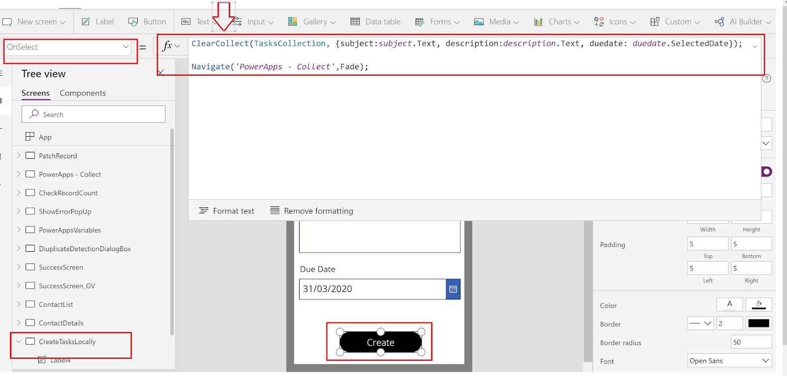 Step 4: Add ClearCollect Function on onSelect property of Create button