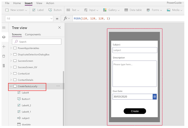 Step 2: Design the Screen1 by adding few controls as shown below (or design as per your requirement). Also add Vertical List Gallery to display Created Task's List.