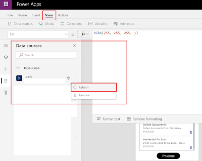 In Canvas App, once you create the data in the data source (D365), you have four possible options in order to get the updated data from the database.- Go to View > Data Sources > Right Click on the Entity/Table > Hit Refresh
