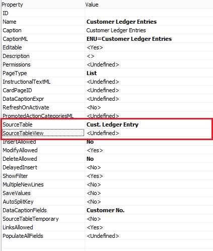 In the following page as you can see source table is set as the Cust. Ledger Entry and Source Table View is empty. That means system will get the sort key from the source table. In this case Entry No.