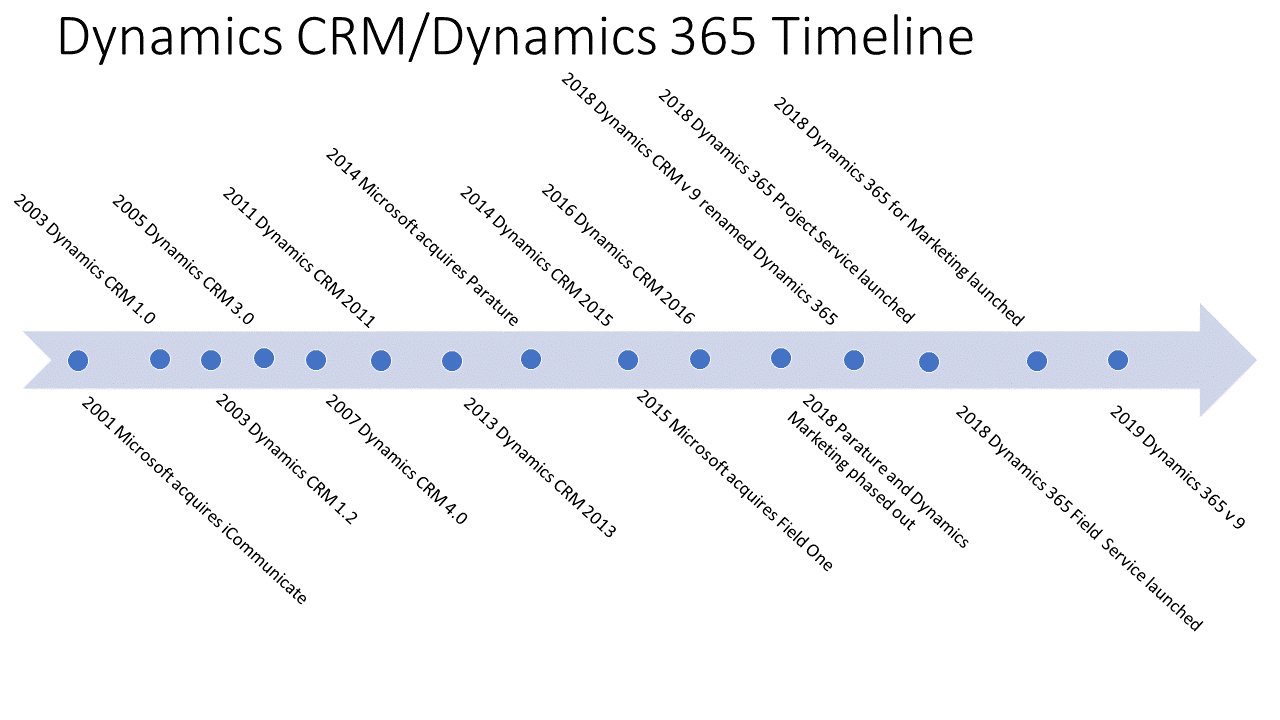 The CRM side of the Dynamics family has a shorter history than ERP, less than twenty years as of this writing.  The following is a timeline which summarizes some key dates for Microsoft Dynamics 365 (formerly Dynamics CRM).