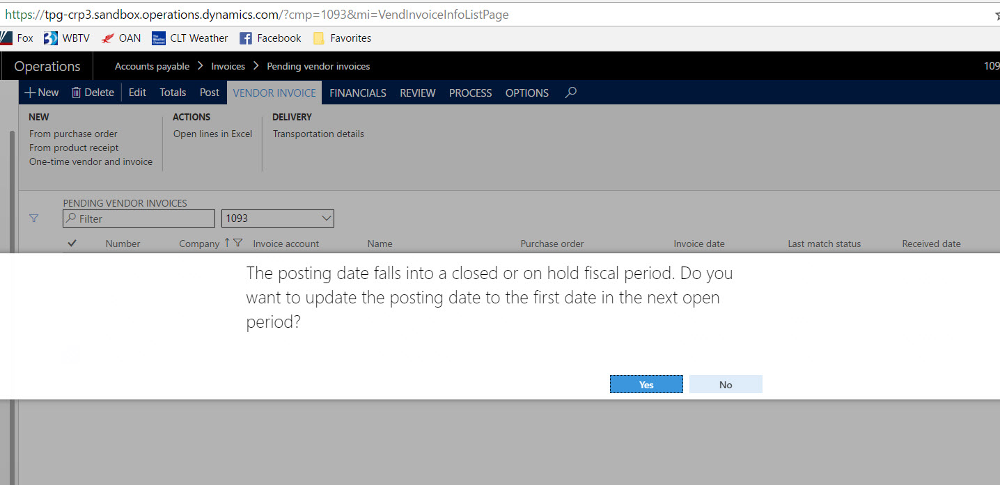 Another filing in 'things learned along the way'. In D365 for Operations, if the Purchasing module is On hold for the period and you try to post a vendor invoice with a date that falls in the On hold period, D365 gives you the option to post into the next open period. I think that is a pretty cool feature.