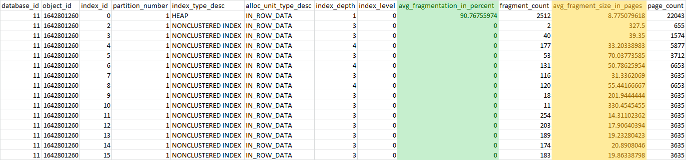 Now, in particular, I have highlighted the Average Fragmentation in Percent and the Average Fragment Size in Pages columns. Also, note that I have executed the function in 'LIMITED' mode, which combines information from all the columns that form part of each index. So, while these fragmentation levels would indicate low defragmentation rates -- which is always desirable -- it means there is still room for improvement. So, let's see what happens after rebuilding the indexes on GL00100 for our test database, then rerunning the stats: