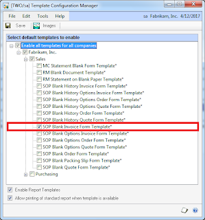 1. If you haven't done so, enable the SOP Blank Invoice Form Template* report under the Template Configuration Manager window. Click Save to continue.