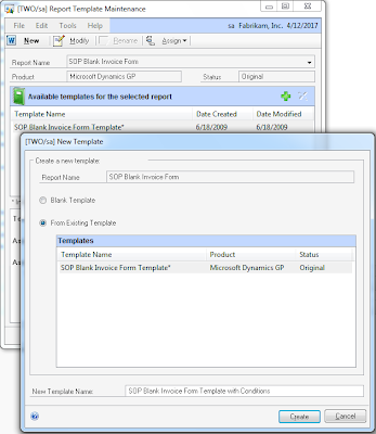 3. Click the New button on the Report Template Maintenance window to create a new template based on the existing one. For this example, we will call this template SOP Blank Invoice Form with Conditions. Click the Create button when finished.