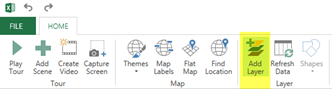 - To add a third Layer to the Power Map report, click the Add Layer button on the HOME tab of the ribbon bar.