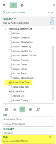- Finally you may like to drag-and-drop the Actual Close Date, or equivalent field, form the list of fields into the TIME area on the Layer Pane to enable the Power Map to display an animated of Opportunity Value by Actual Close Date.