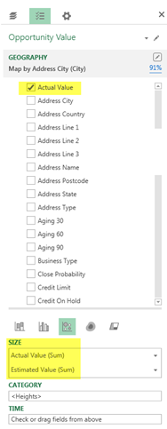 - Select the Actual Value and Estimated Value, or equivalent fields, from the list of fields so that the Bubble charts displayed on the Power Map report are summarised by Account Value and Estimated Value.