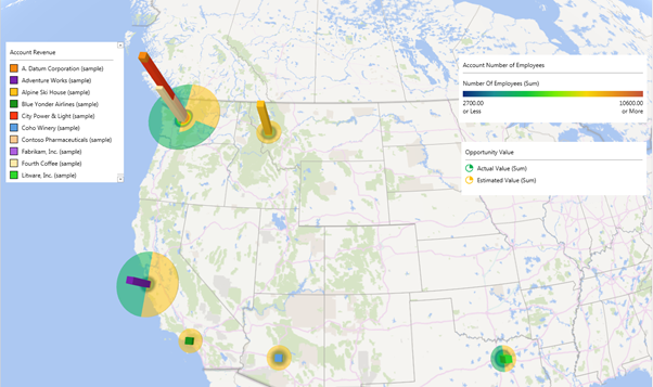- The Power Map report now looks similar to the following. As a result of configuring this layer an Account Revenue legend has also been added to the report.