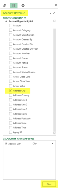 - Geographically segment the Opportunity Revenue layer by selecting the Address City, or equivalent field, from the list of fields and then click Next to continue.