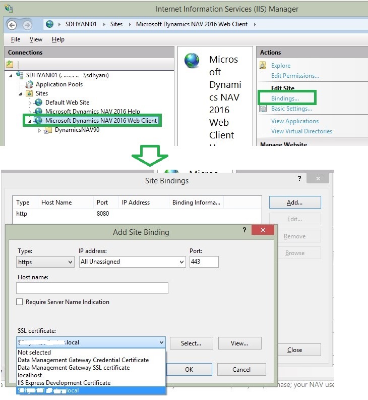 3. From Right Hand Panel Select Binding and create a Binding for https using the certificate you added in Step 1, as shown below.