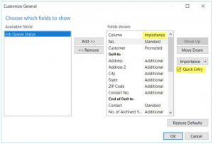 - Quick Entry — The Quick Entry feature allows you to quickly jump between essential data entry fields. Check this box for any fields that are typically filled in when entering a record. Press the Enter key to skip between the Quick Entry To access a skipped field, use the Tab or Shift-Tab keystrokes to cycle through every field on the Page.