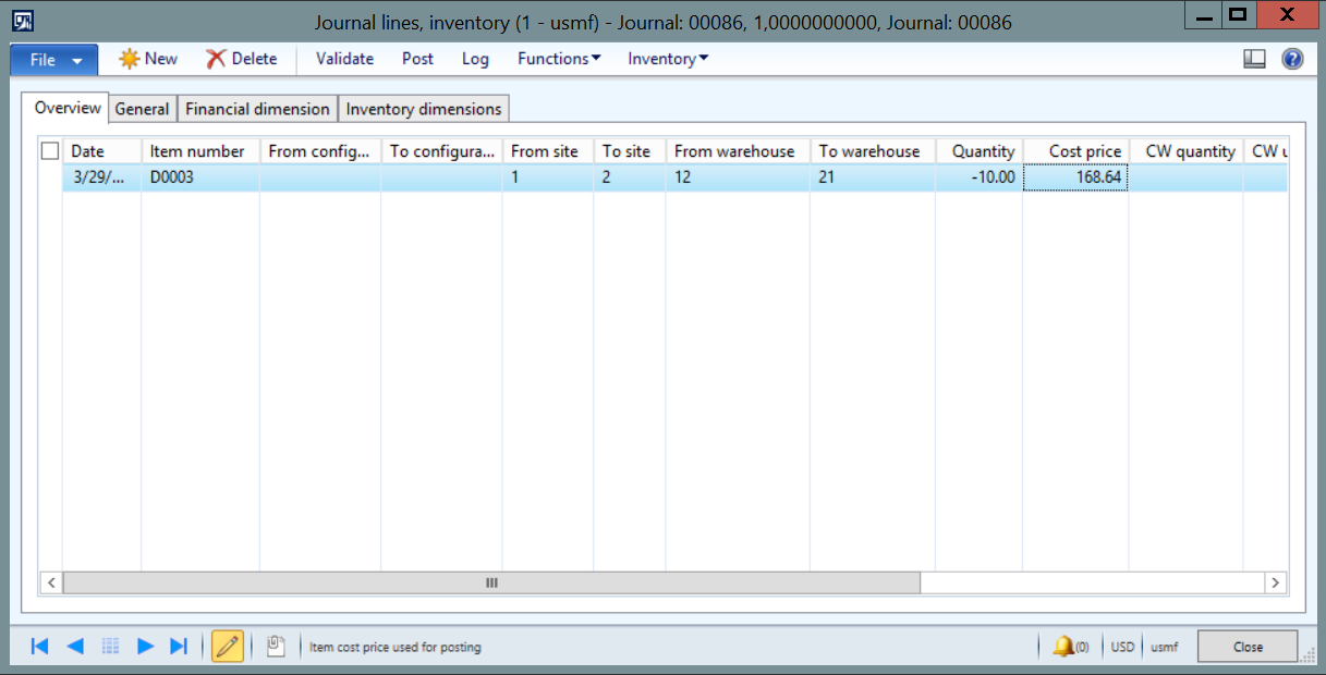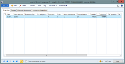 7. Here in this journal, we are transferring the item D0003 between Site1/Warehouse 12 to Site2/Warehouse 21 so,