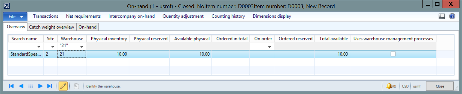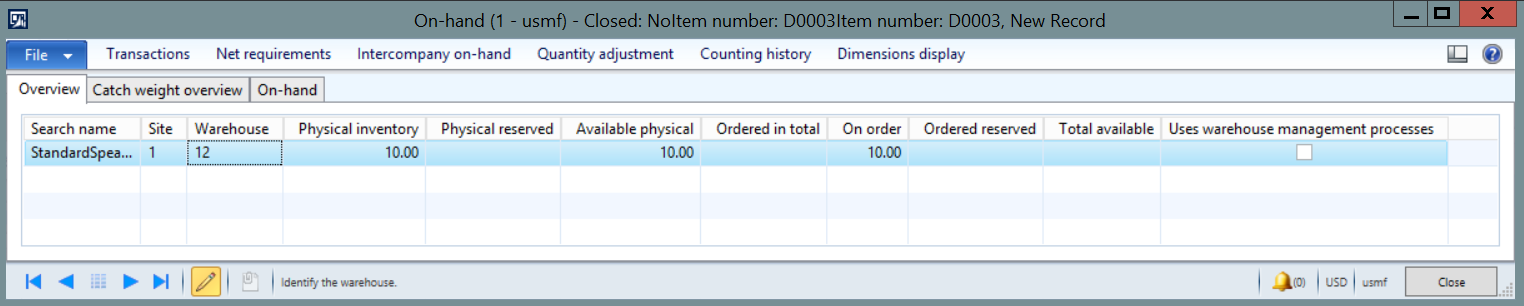 Note: Before the transfer, the On-hand inventory for the item D0003 at the Site1/Warehouse 12 was 10.
