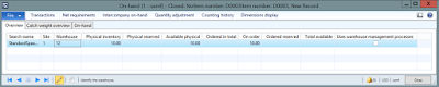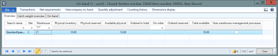 8. Check the On-hand inventory, you can see 10 quantity is transferred from Site1/Warehouse 12 to Site2/Warehouse 21